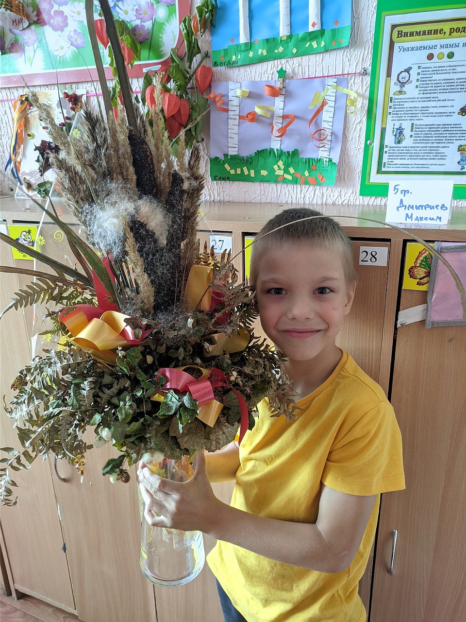 Максиму 6 лет. Для создания букета использовались природные материалы, такие как папоротник, рогоз, тростник, кленовые листья. Букет украшен блестками и бантами.
