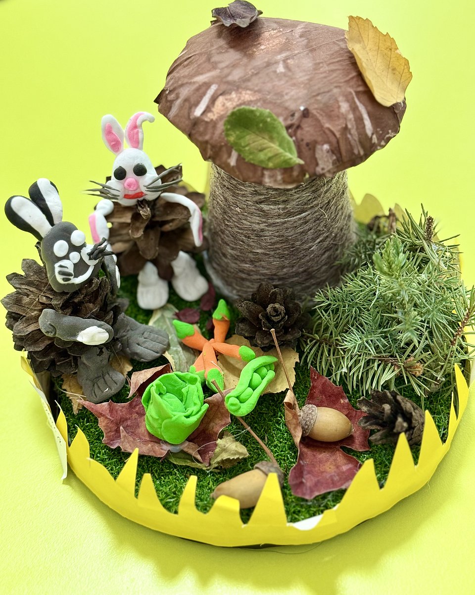 Блбулян Моника , 4 г., Поделка сделана из природных материалов и пластилина. При создании композиции применялась техника конструирования и аппликации.