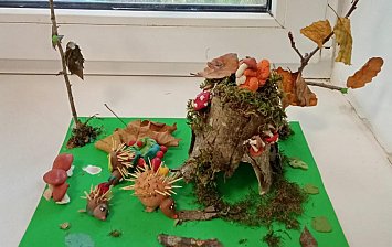 Роботу выполняла девочка трёх лет, вдохновлённая осенними яркими красками, в работе использовались природные материалы а также акриловая краска.