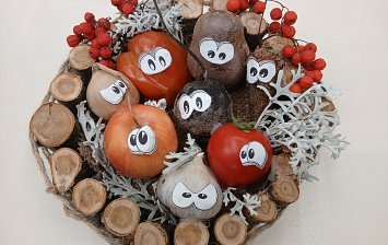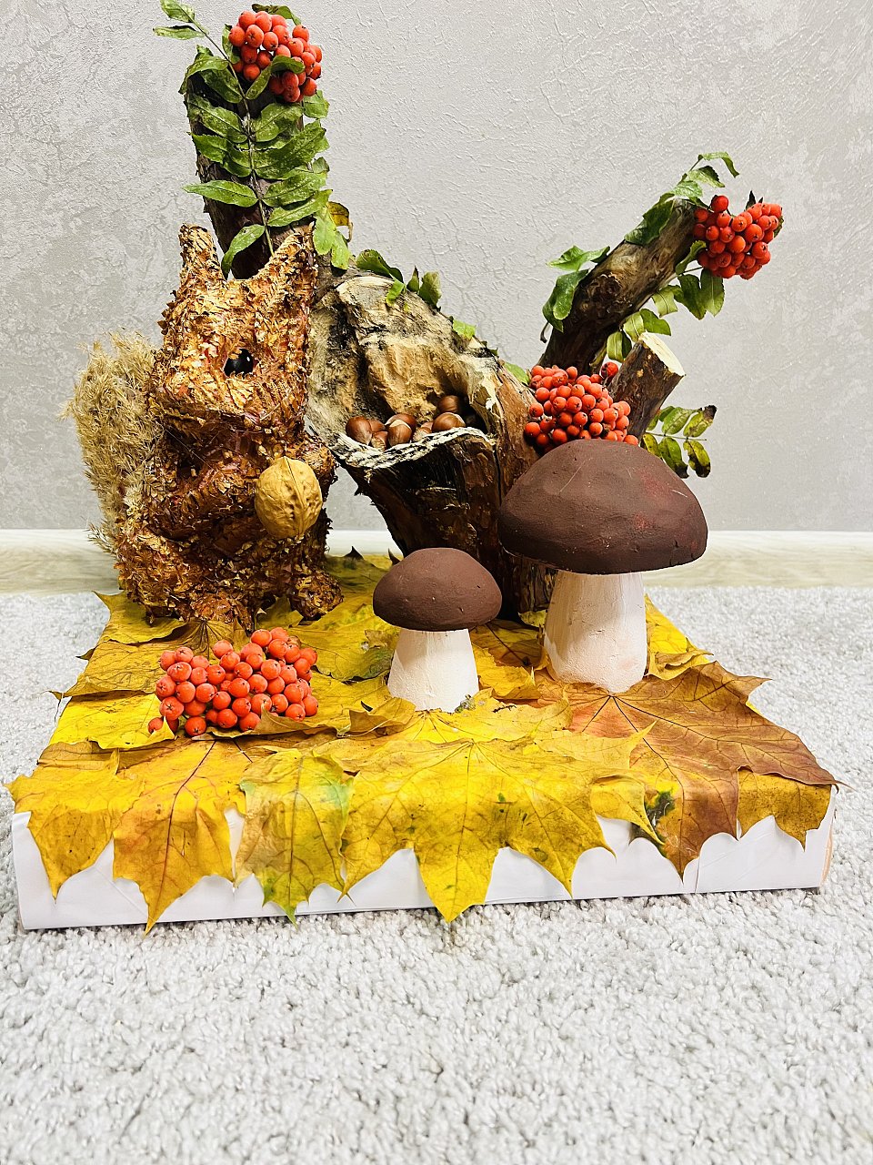 Возраст 5 лет. Материалы: листья клена, калина, пластик, природные материалы, листья папоротника, сук дерева, орехи.