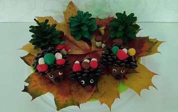 4 года, поделка, веточки, листья, шишки, спил, ягоды, хвоя, солёное тесто, краски, клей.