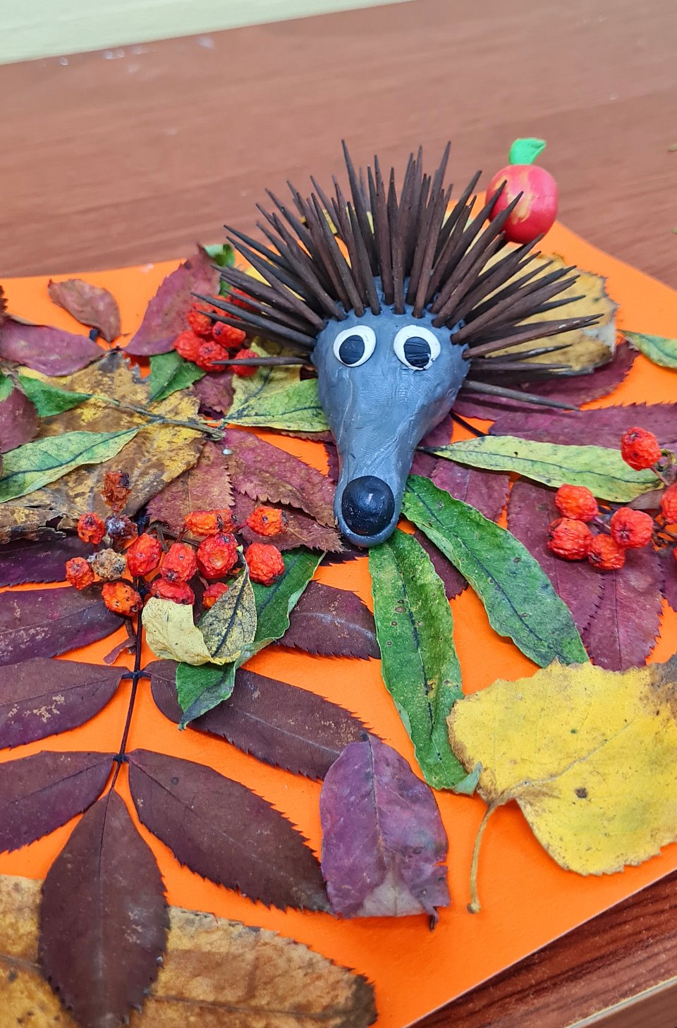 4 года; Лепка, аппликация; Материал: пластилин, зубочистки, сухие листья, картон, клей ПВА, ягоды рябины;