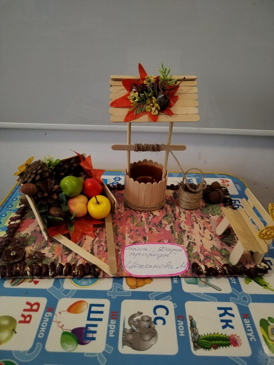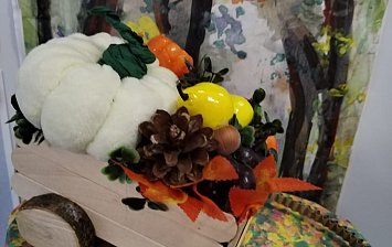Шишки, муляжи фруктов, деревянные палочки, бичевка.