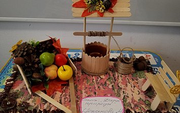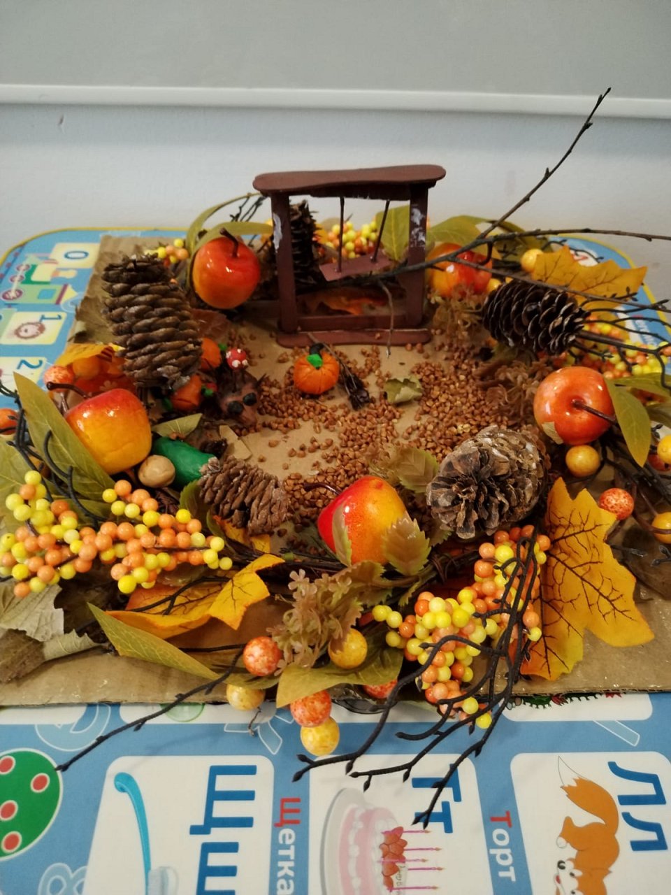 Шишки, муляжи фруктов, деревянные палочки, картон.