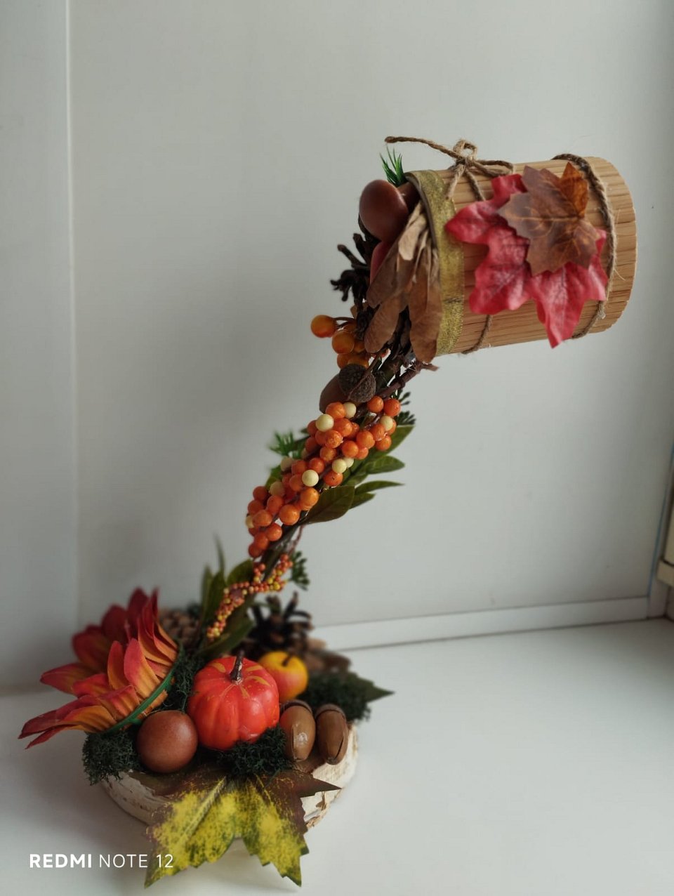 Работа выполнена воспитанником (5 лет) из природного материала: дерево, джут, листья, ветки, муляжи овощей, фруктов и ягод.