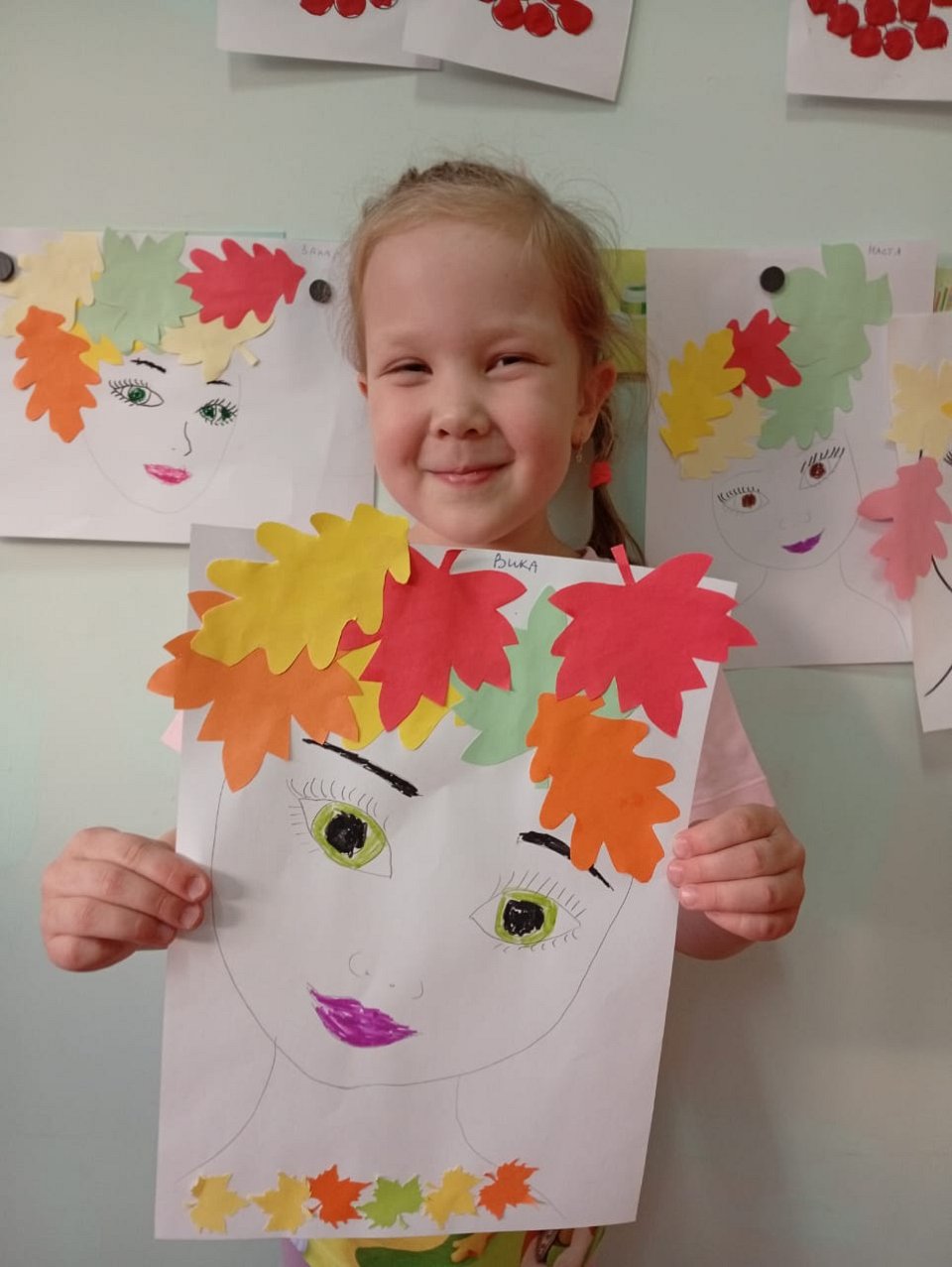 Воспитанница 5 лет сделала аппликацию из цветной бумаги. Использовала разноцветные листики для волос и фломастеры для раскрашивания лица.