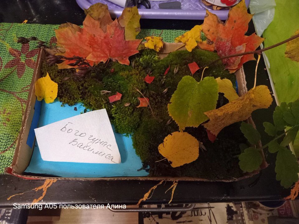 Работа выполнена из природных материалов, собранных во время прогулки. На картонной основе создана маленькая осенняя полянка, покрытая мягким мхом и разноцветными листьями. Композиция передаёт красоту и богатство осенней природы, её яркие краски и уютное настроение.