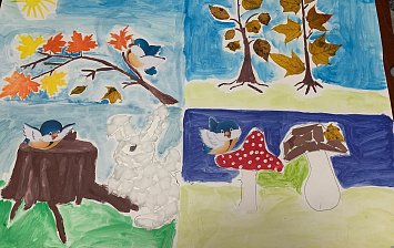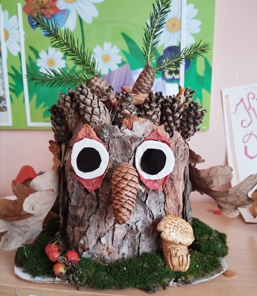 5 лет. Картон, кора деревьев, шишки, ветки ёлки, бумага цветная,листья