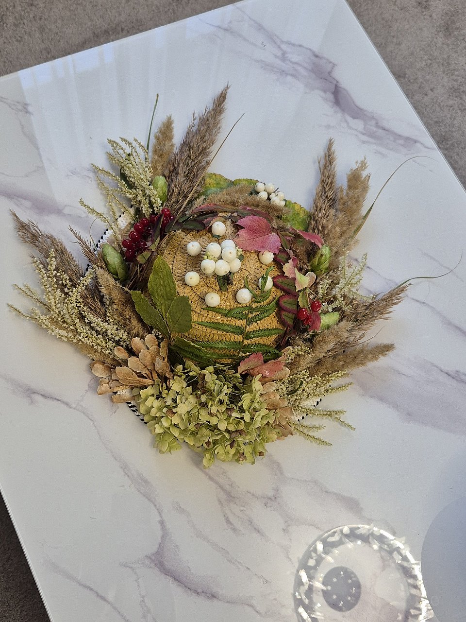 возраст 7 лет. Соломенная шляпа украшена листьями рябины, березы, папоротника, плодами калины и снежноягодника, шишками хмеля, сухоцветами, гортензией, веточками сирени и семенами клена, собранными собственноручно.