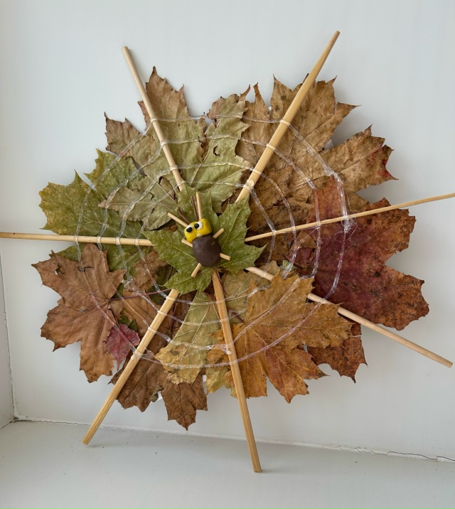 Алене 9 лет. При изготовлении поделки использованы: пластилин , высушенные листья, палочки, клей