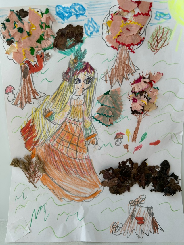 Яне 9 лет. Для работы использовались: карандаши, фломастеры, бумага, карандашная стружка, клей