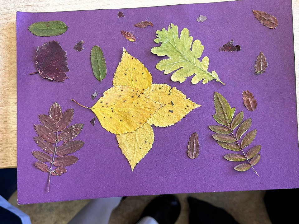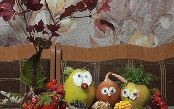 Фоном для этой удивительной птицы служит густой осенний лес, созданный также из натуральных листьев, но уже разнообразных оттенков – красных, оранжевых, коричневых.