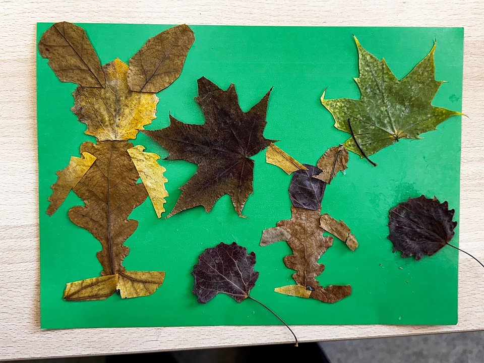 Представляем вашему вниманию работу "Листопадные зайки", в которой обычные осенние листья превратились в милых лесных жителей. Зайчата, выполненные из тщательно подобранных листьев разных цветов и размеров, выглядят очень живо и реалистично. Фон работы также выполнен из листьев, передавая атмосферу осеннего леса.