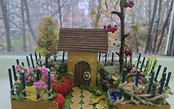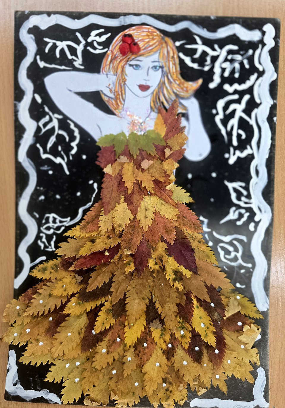 Плоскостное изображение осенней хозяйки природы. Аппликация. Засушенные листья