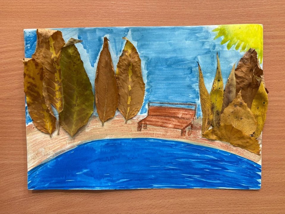 Представляем на конкурс работу – "Осенний парк", выполненную в смешанной технике. Фон пейзажа, изображающий осеннее небо и далекий лес, создан с использованием акварельных красок, что придает ему воздушность и мягкие цветовые переходы. Цветными карандашами прорисованы детали: осенняя трава, стволы деревьев и, конечно же, уютная парковая скамейка, которая становится центром притяжения взгляда. Но главная изюминка работы – это объемные кроны деревьев, бережно собранные и приклеенные из настоящих осенних листьев разных форм и оттенков. Такое сочетание материалов позволяет создать реалистичный и одновременно сказочный образ осеннего пейзажа, демонстрируя наблюдательность и творческую фантазию автора.