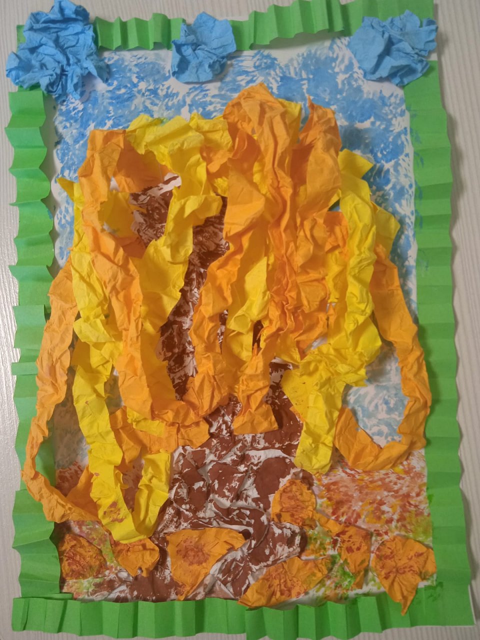 10 лет, Объемная аппликация из рельефной цветной бумаги . Материалы: рельефная (мятая) бумага, заранее подготовленная (облака,листва - цв.бумага, ствол дерева - белая бумага). Краску акварельную на ствол дерева, землю и небо накладывали методом "тычка". Рамка аппликации выполнена в технике "гофрирование".