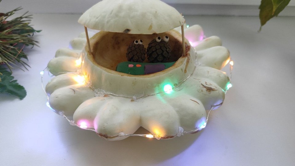 Вероника - ученица 1 класса, работа была выполнена в сотрудничестве с мамой и папой. Были использованы патисон, шишки, пластилин, гирлянда.