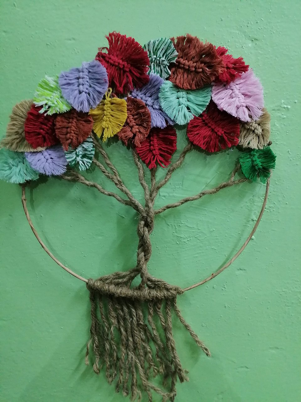 Автору 12 лет. Работа выполнена в технике "Макраме" из хлопковых и джутовой нитей.