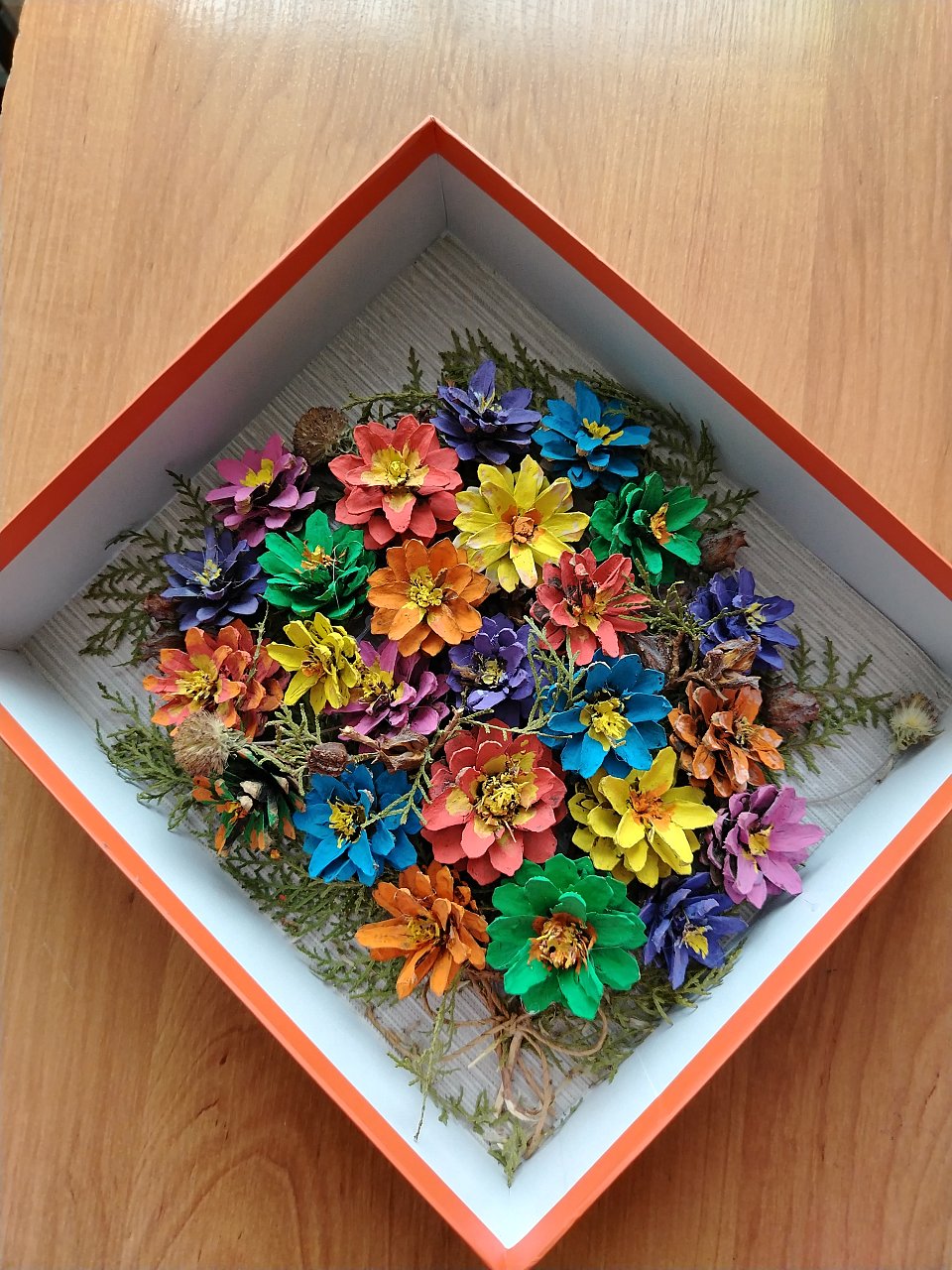 ученица 6 класса, 11 лет. Работа выполнена из сосновых шишек. Приклеены в форме букета. Покрашены в разные цвета гуашью. Композиция дополнена веточками туи.
