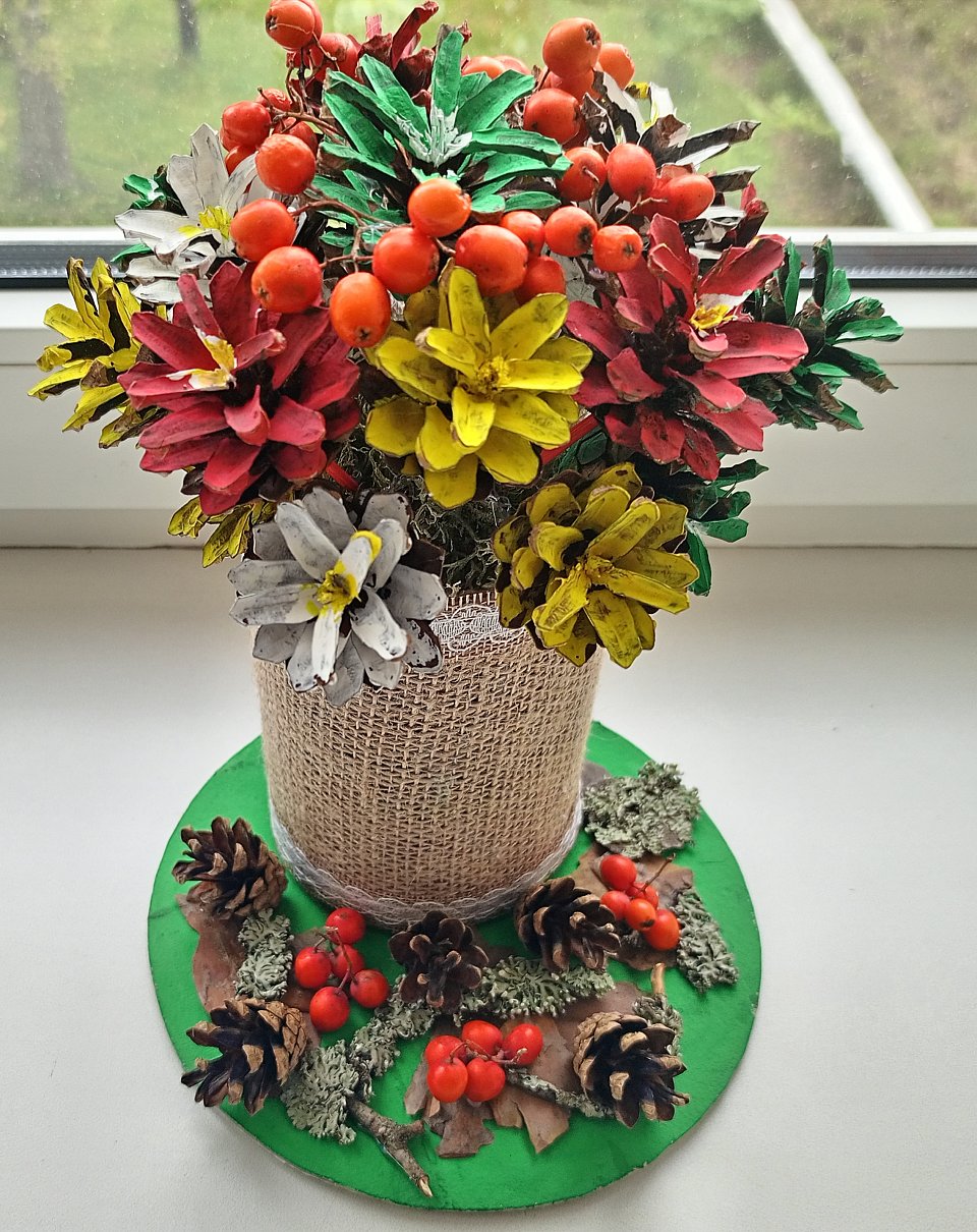 Материалы : шишки, ягоды рябины, мох, деревянные шпажки, сухие веточки, гуашь, картон, пластиковая бутылка, мешковина, термоклей