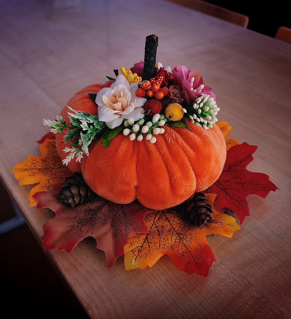 Смешанная техника, ткань плюш, синтепух, искусственные кленовые листья, тычинки, цветы, сахарные ягоды; пайетки листочки, спил ясеня 16 см, шишки, прутик дерева