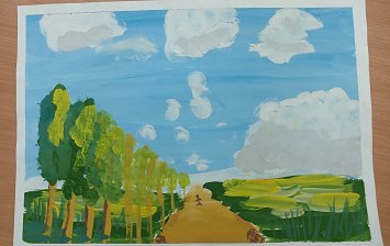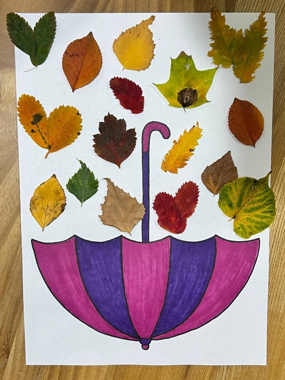 Гордей Желтов, 10 лет, 4 класс. Маркеры, черный контуринг; природный материал - листья, канцелярский клей.