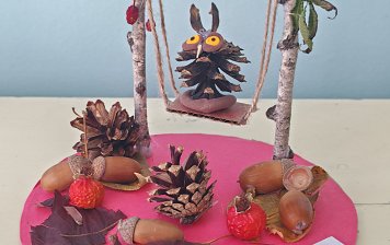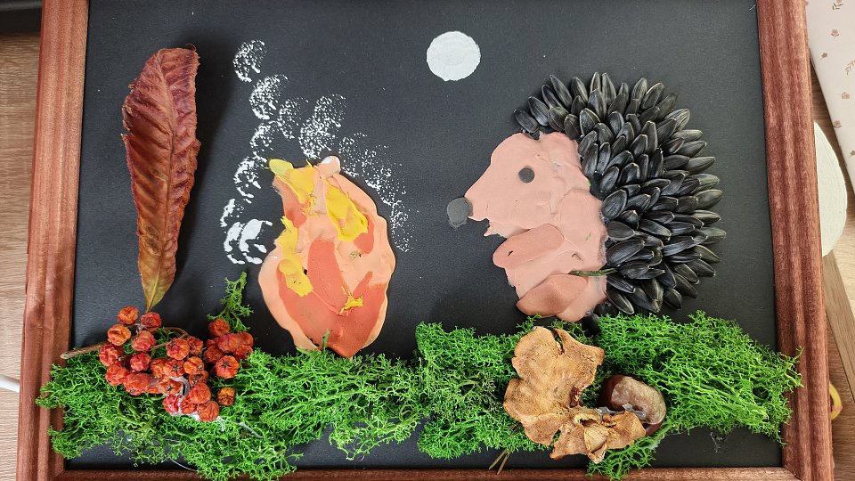 4 года, из природного материала ( каштан, семечки, листья) , воздушного пластилина и мха