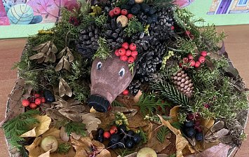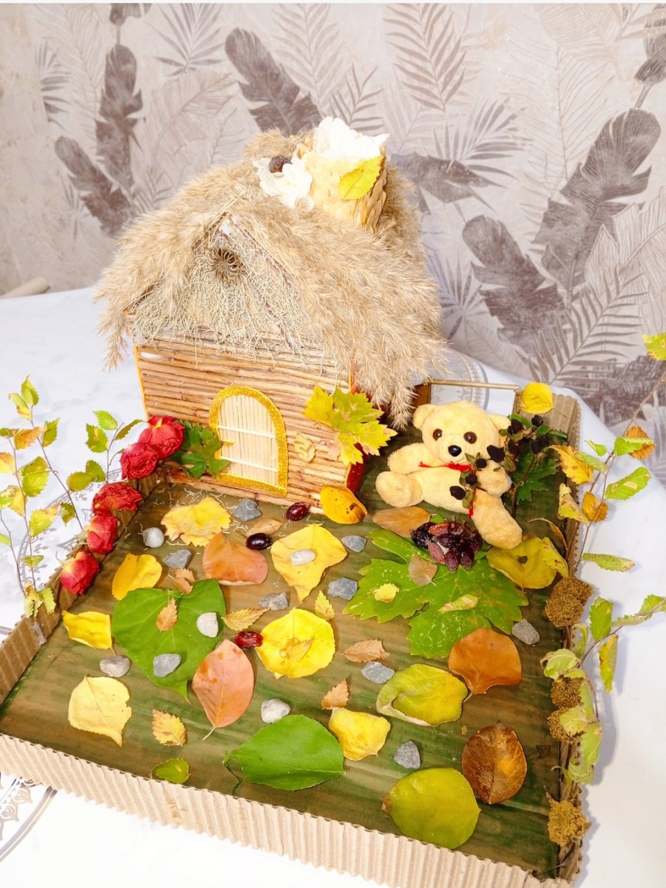 Поделка из природных материалов с использованием веток, опавших листьев, декоративных растений таких как роза, шиповник и т.п., так же былы использованы камушки.