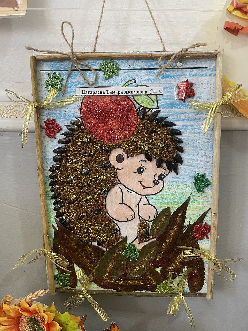 Возраст 4.5 года , с родителями вместе изготовили забавного ежа из подручных и природных материалов, семечек, ленточек)