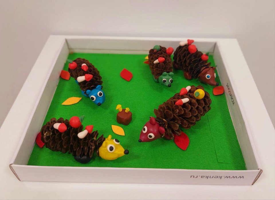 Мы решили сделать осеннюю поделку, используя природные материалы. Основу нашей работы составили шишки, из которых мы конструировали "ёжиков". Чтобы сделать нашу композицию более живой и выразительной, мы добавили для образа пластилин. Это был увлекательный процесс, который позволил нам проявить фантазию и создать что-то по-настоящему осеннее!