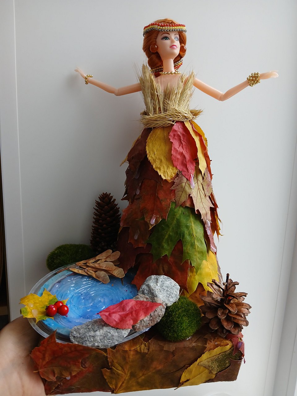 Возраст 6 лет,работа выполнена из природного материала:листьев,мода.