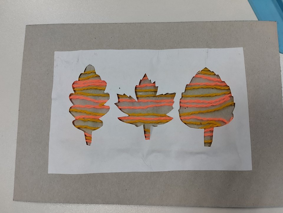 Использована пряжа оранжевого, красного и желтого цветов. Клей карандаш. Лист картона и белый лист бумаги.