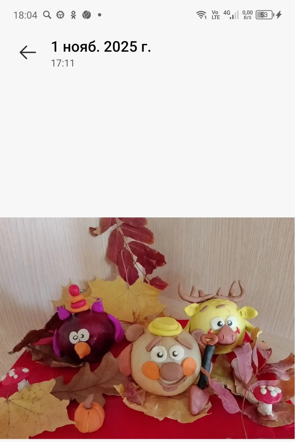 3 года 8 месяцев. Поделка из овощей, фруктов, пластилина, зубочисток, осенние листья, картон