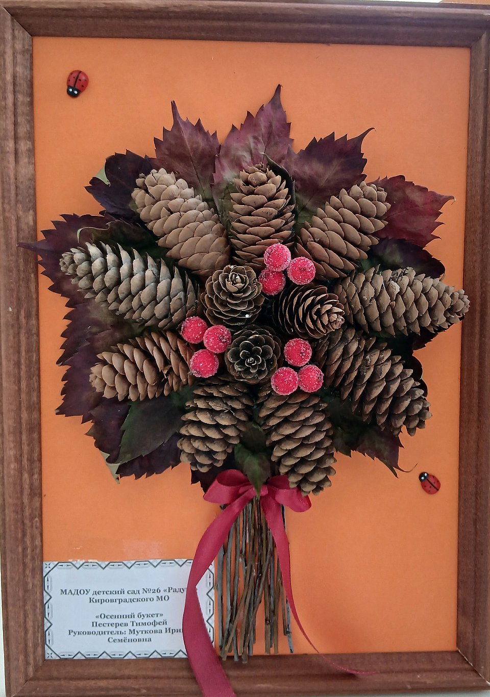 4 года, Прутики из леса, шишки лесные, осенние листья, ленточка,декоративные божьи коровки, рябина , клей картон, рамка.