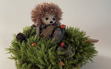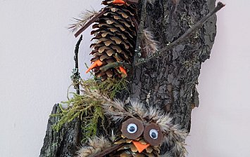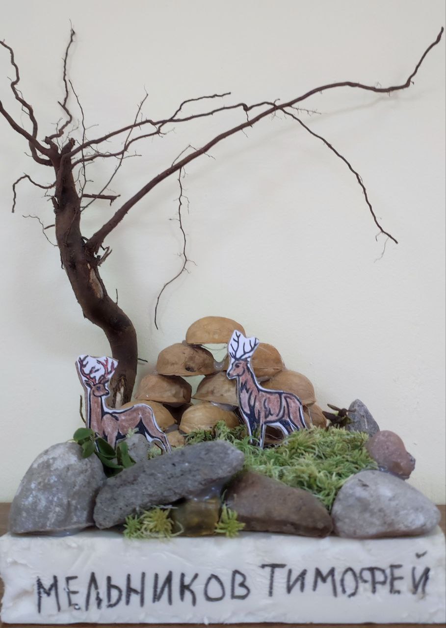 Работа выполнена шестилетним мальчиком. Основание композиции полистерол плита на которой из мха выполнено поле и камни. Из скорлупы орехов грецких сделана гора. Дерево выполнено из корня. Также присутствуют кустики брусники и мохито разных видов. Олени выполнены из картона.