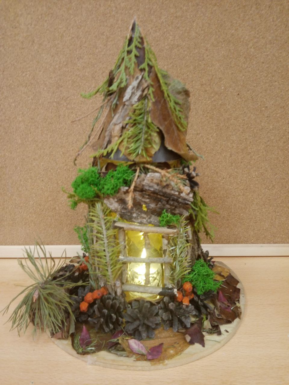 Уютное жилище, собранное из даров леса: коры, листьев, шишек и мха. Сквозь резное окошко струится мягкий свет, намекая на присутствие доброго лесного духа, который заботится о своем маленьком лесном мире.