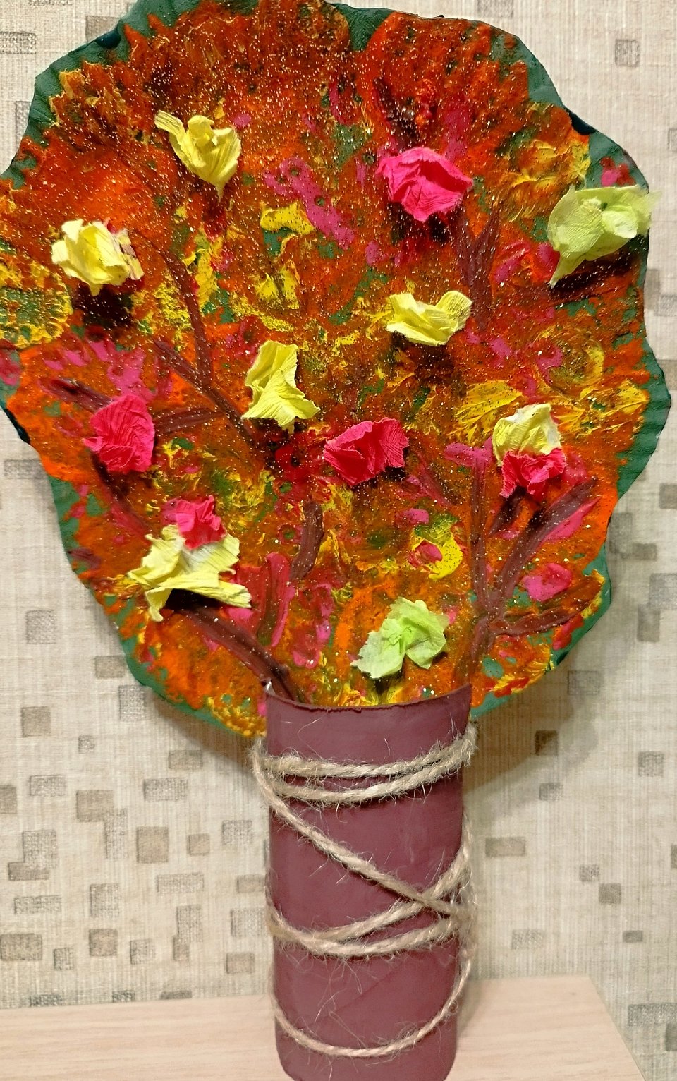 Творческую работу "Золотое дерево" сделала Кузнецова Таисия, 7 лет. Данная работа выполнена в технике декоративно-прикладного творчества. Таисия использовала следующие материалы: бумажную салфетку, втулку, гуашь, цветную бумагу.