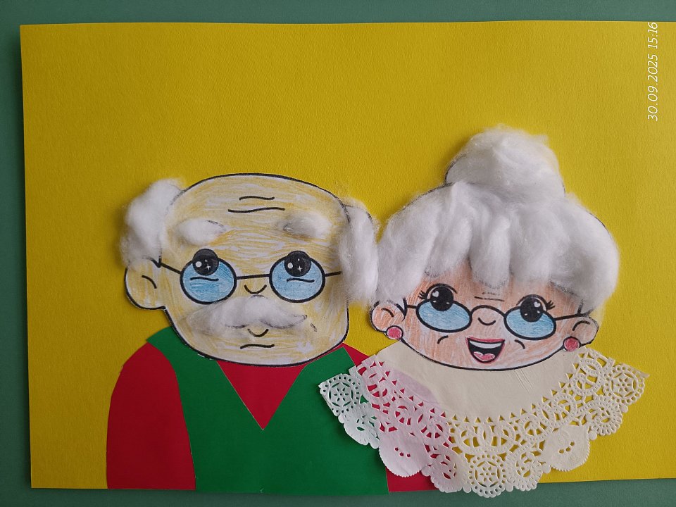 Цветная бумага, клей, вата, карандаши, шаблоны лиц бабушки и дедушки, ажурная салфетка