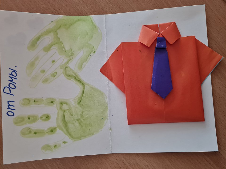 Степанов Рома, 4 года, выполнил поделку в виде открытки с использованием картона, цветной бумаги и пальчиковой краски в технике "рисование пальчиками"