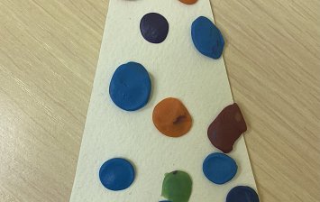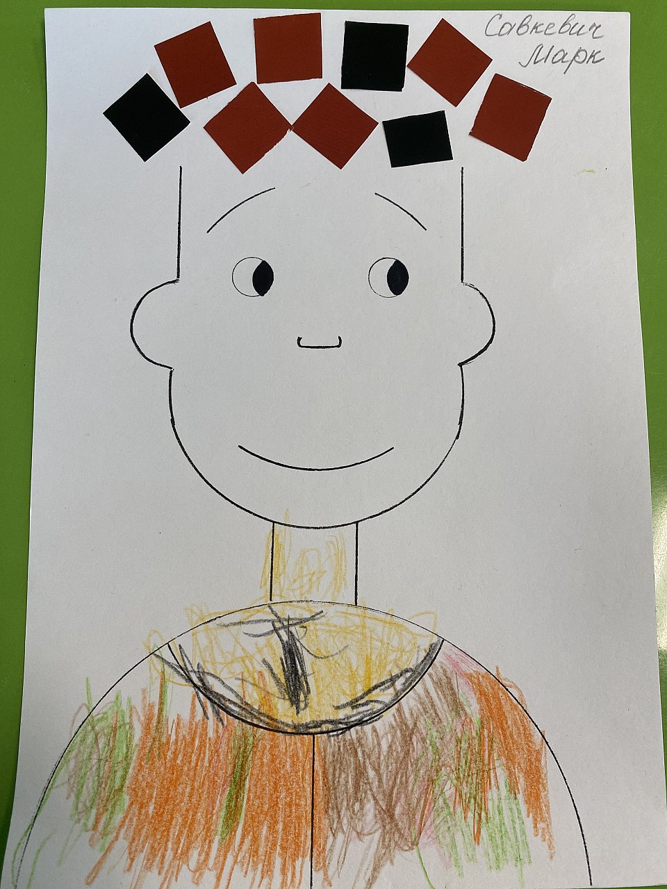Возраст участника 4 года; форма выполнения работы -аппликация,с использованием цветной бумаги и раскрашивание восковыми мелками.