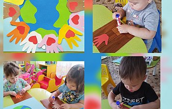 Уголок оформили дети подготовительной группы. Вырезали цветные картинки, посадили кукол в разных национальных костюмах, положили книгу "Народы мира", альбомы "Мы разные, мы равные", "Народные костюмы", гексы
