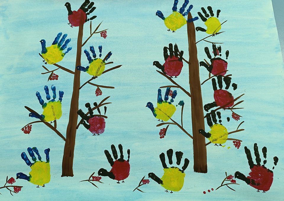 Работа выполнена в нетрадиционной технике при помощи ладошек.Использованные материалы: