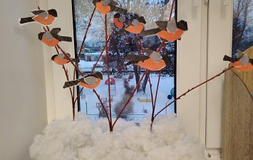 Возраст участника- 9 лет. Работа выполнена при помощи рисования и аппликации. Для создания объемной композиции были использованы: веточка клёна, "крылатки" семена клёна, грудки снегирей созданы с помощью наклеивания скрученных кусочков красной салфетки.