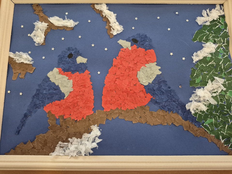 6 лет, обрывная аппликация: цветная бумага,картон,бумажные салфетки,клей ПВА,деревянная рамка.