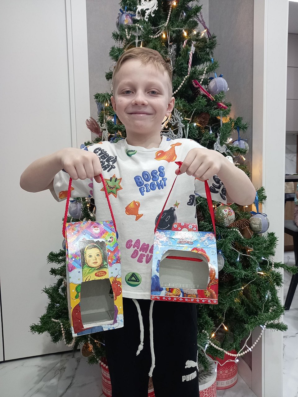 Возраст: 9 лет. Кормушки изготовлены из картонных коробок.