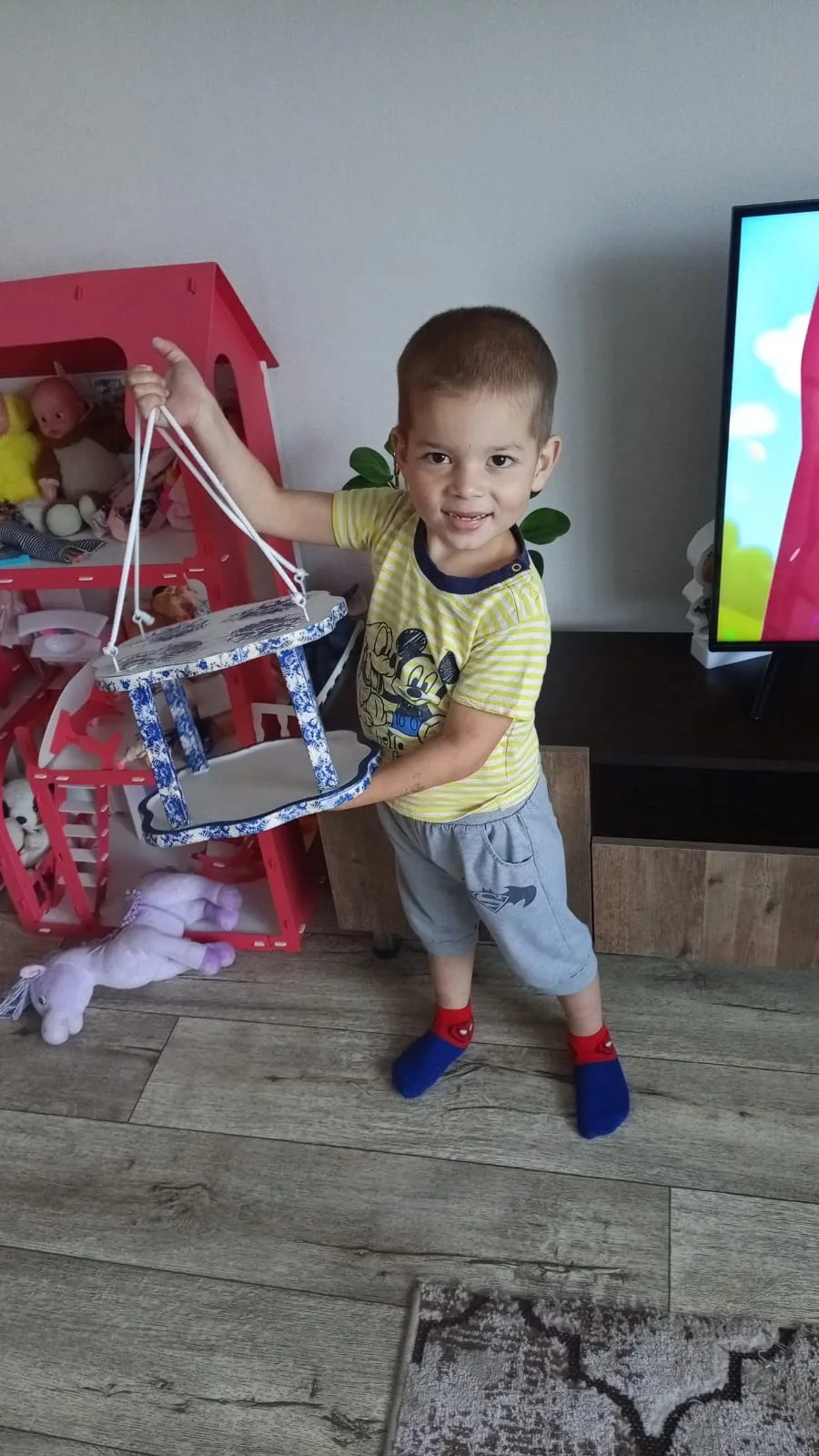 Евгений 4 года с папой изготовил поделку: доски , веревка , краска , клей , салфетки в стиле Гжель