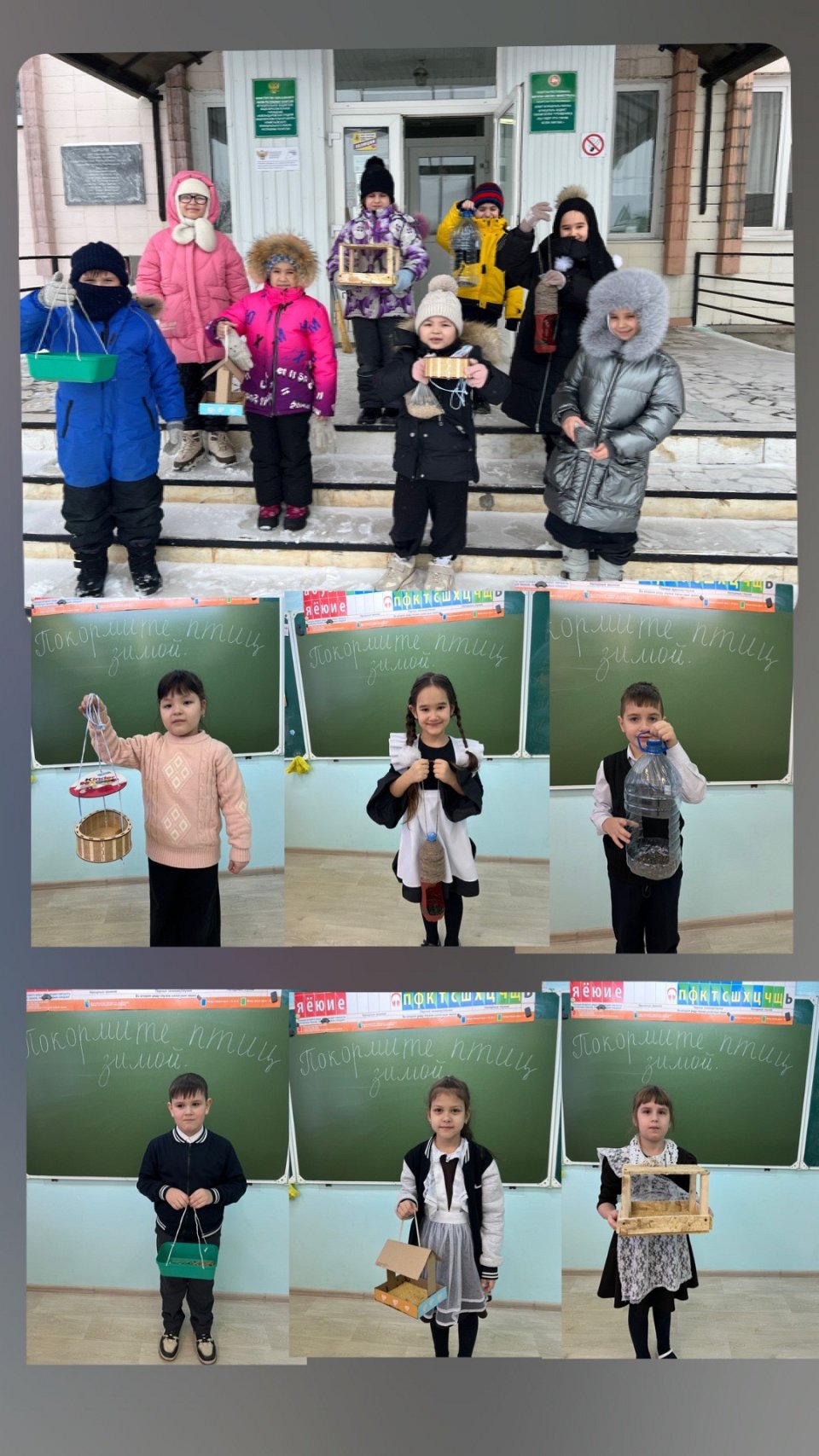 Ученикам 7-8 лет. Они из подручных материалов изготовили кормушки, насыпали корм и повесили на деревья