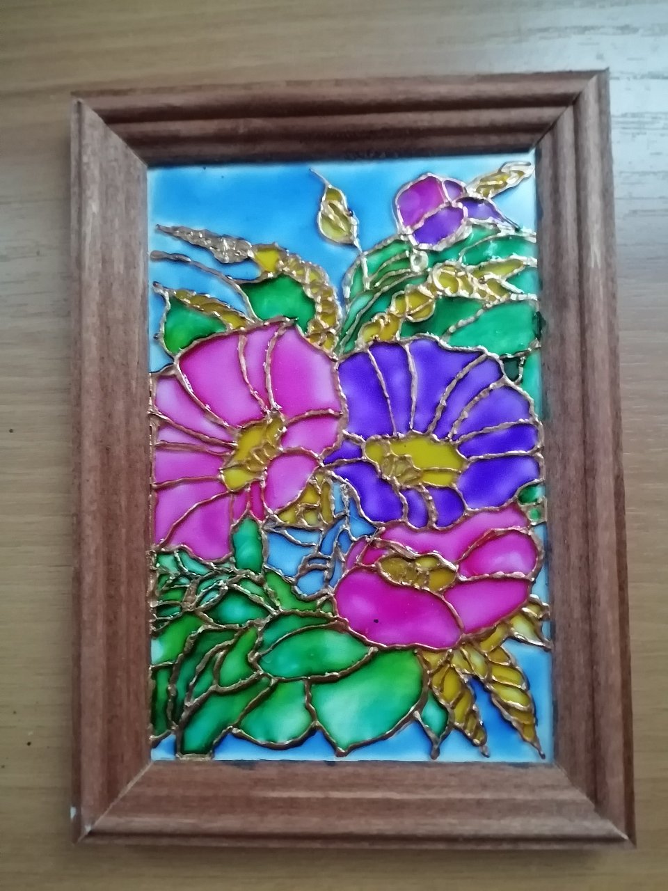 Автору 12 лет. Работа выполнена на стекле акриловыми контурами и витражными красками.