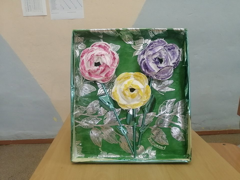Ученица 2 а класса при выполнении своей поделки использовала различные материал: коробка, оберточная бумага, глянцевая цаетная бумага, салфетки и гуашевые краски.