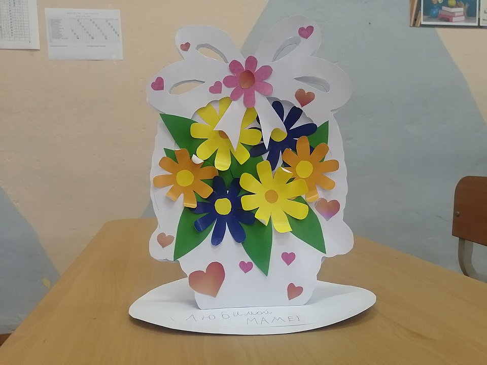 Работу выполнил ученик 2 класса в технике объёмная аппликация. Использованы плотная бумага и цветная бумага.